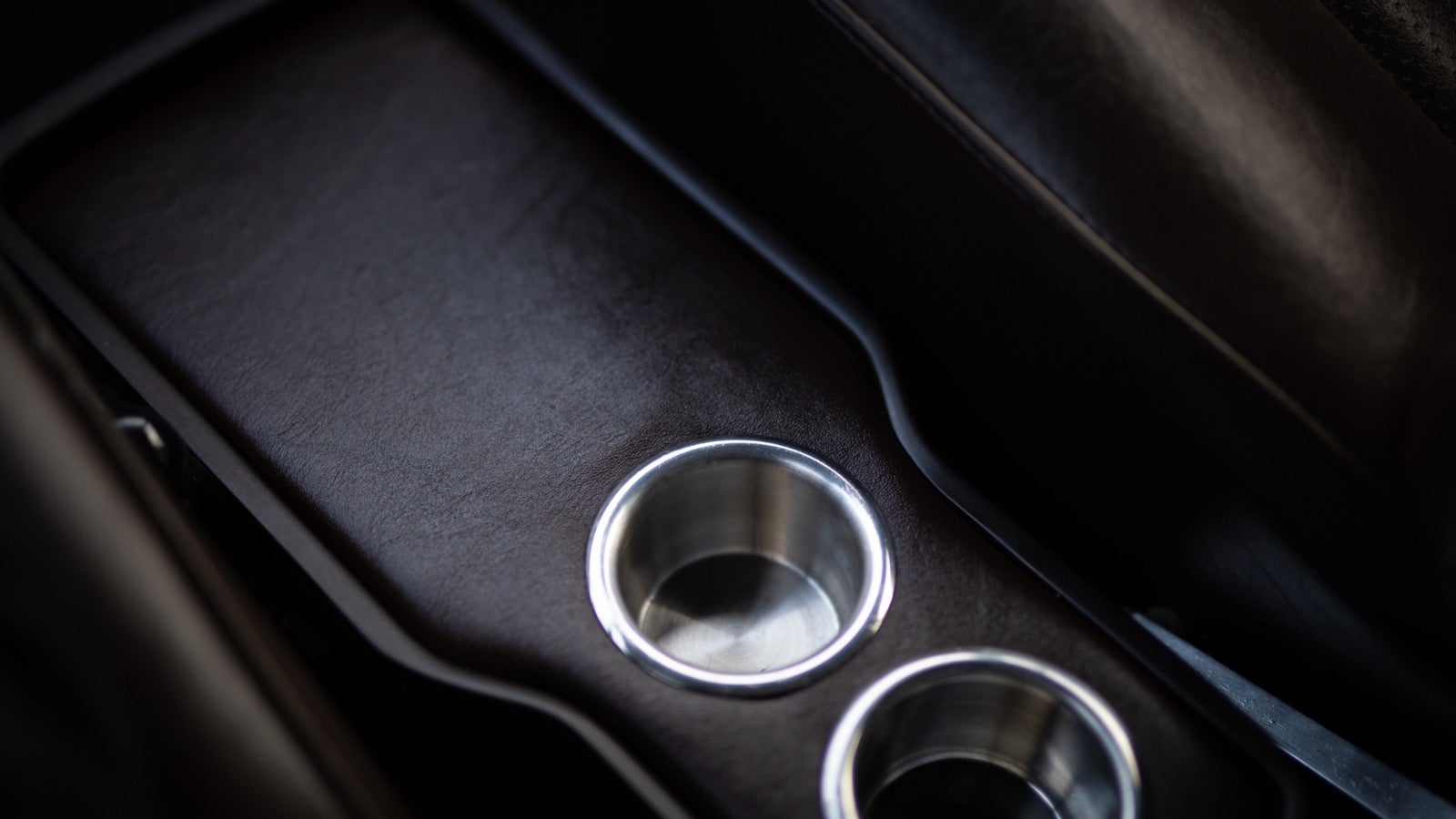 Midterkonsol betrukket med samme brun ‘’læder’’ som kabine, med kopholder og trådløs opladning til mobil.