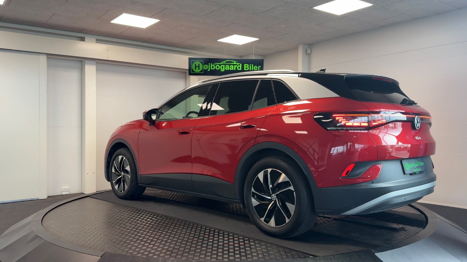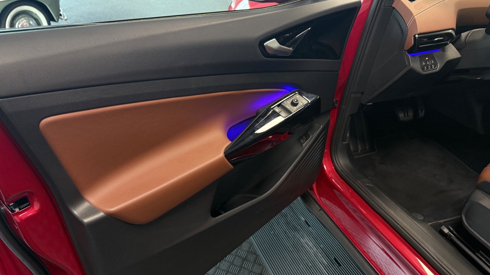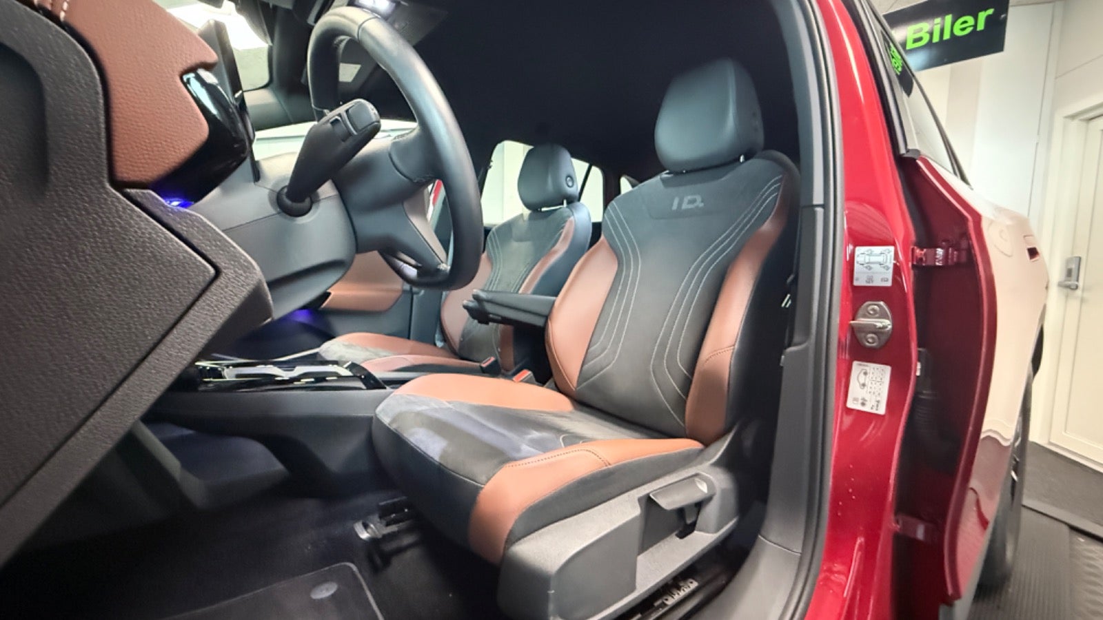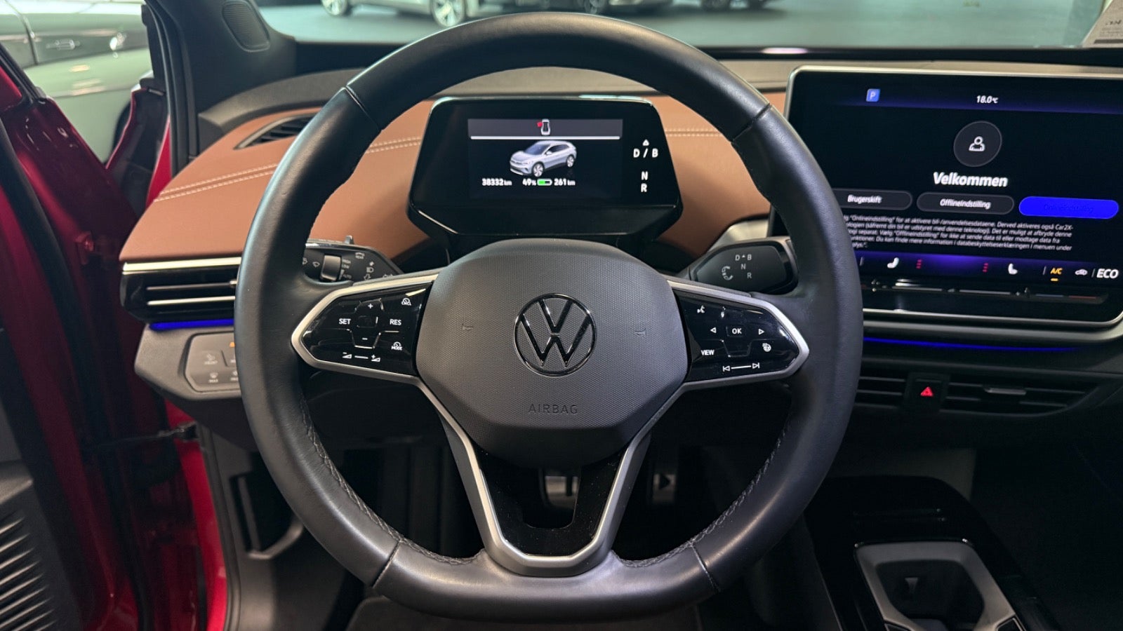 Veludstyret ID.4 i den super flotte ´ Kings red ´ farve og matchende dellæderkabine i grå/brun læder og med bl.a 360 kamera, el-bagklap, matrixlys, Travelassist mm. Mulighed for opkobling med app til bl.a forvarmning af kabine.